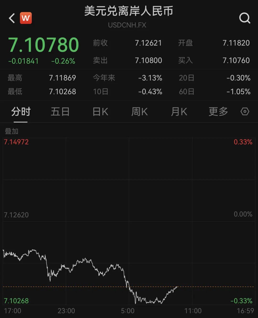其他市场方面,人民币汇率走强,截至发稿,离岸人民币兑美元一度涨超200个基点。